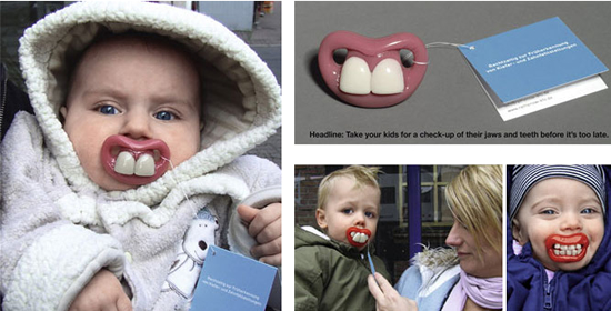 実用的な広告から、ネタっぽいものまで。面白いアイデアが盛り込まれたユニークな屋外広告を集めてみました。トピック:歯科医院が屋外で配布した広告。「歯並びのチェックは赤ちゃんの頃から」と、おしゃぶりで明確なメッセージを伝えています。<ドイツ>