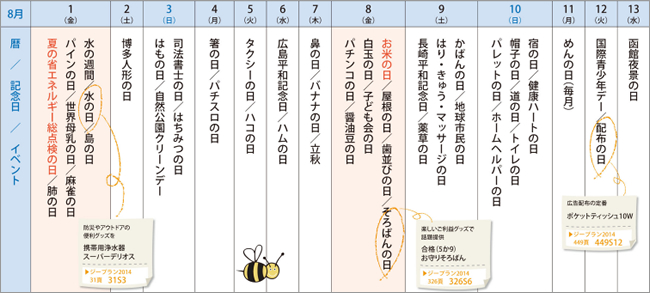 2014年8月の前半に実施される国民的イベントや記念日を調べてみました。企業や店舗、自治体の集客プロモーションや販促キャンペーンに記念日を活用しましょう。祭りにレジャー、お盆帰省。イベントムードを盛り上げて夏本番!