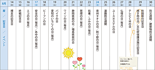 2014年8月の後半に実施される国民的イベントや記念日を調べてみました。企業や店舗、自治体の集客プロモーションや販促キャンペーンに記念日を活用しましょう。祭りにレジャー、お盆帰省。イベントムードを盛り上げて夏本番!
