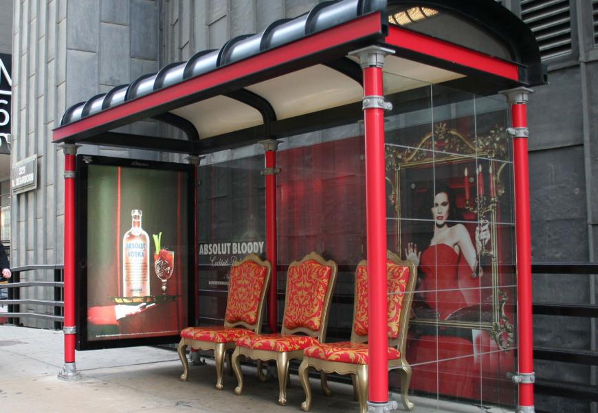 実用的な広告から、ネタっぽいものまで。面白いアイデアが盛り込まれたユニークな屋外広告を集めてみました。トピック:ウォッカ(アブソルート)のバスシェルター広告。バスの停留所をリッチなラウンジに見立てたようですね。<米国>