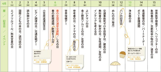 2014年4月の前半に実施される国民的イベントや記念日を調べてみました。企業、店舗、自治体の集客プロモーションや販促キャンペーンに記念日を活用しましょう。新学期、お花見、月末はGW。提案型の訴求でフレッシュな春を演出。