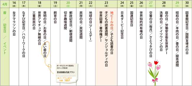 2014年4月の後半に実施される国民的イベントや記念日を調べてみました。企業、店舗、自治体の集客プロモーションや販促キャンペーンに記念日を活用しましょう。新学期、お花見、月末はGW。提案型の訴求でフレッシュな春を演出。