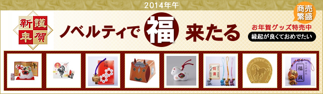 販促ノベルティ卸売りセンターでは、縁起が良くおめでたい2014年お年賀グッズ、お年賀ノベルティをご用意しました。新春初売りの販促やお年始営業ツールとして、是非、ご活用ください。干支・縁起物・福袋などは、新年1月15日までのお取扱いとなります。