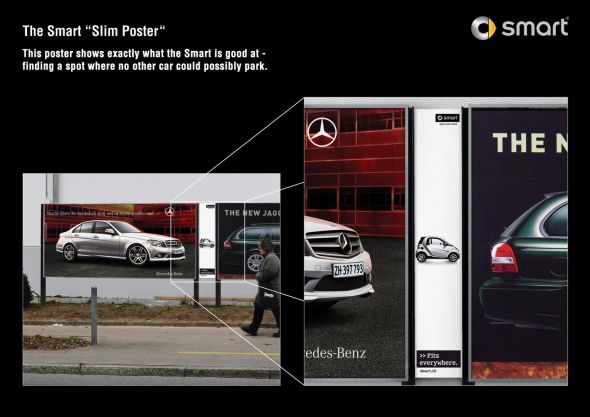 実用的な広告から、ネタっぽいものまで。面白いアイデアが盛り込まれたユニークな屋外広告と野外看板を集めてみました。トピック:スマートの屋外広告。よく見ると看板と看板の隙間に小さな広告があり、スマートのコンパクトさを上手く表現してます。<スイス>