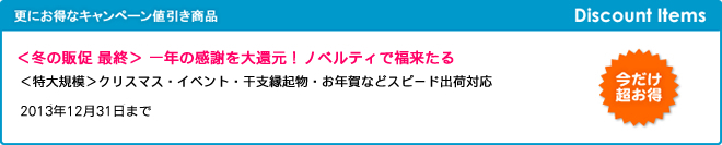 本年も残すところあと30日。販促ノベルティ卸売りセンターでは、今年最後の値引きキャンペーンを通常の2倍の特大規模で開催いたします。お得なこの機会にノベルティ&粗品景品をぜひご検討ください。最短翌日出荷、2013年12月31日まで。
