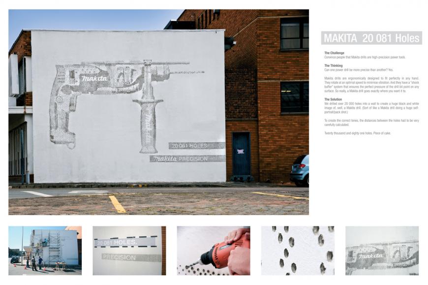 実用的な広告から、ネタっぽいものまで。面白いアイデアが盛り込まれたユニークな屋外広告と野外看板を集めてみました。トピック:電動工具(マキタ)の屋外広告。電動ドリルで穴を開け、電動ドリルを表現。穴の数は20,081個、お見事です。<南アフリカ>