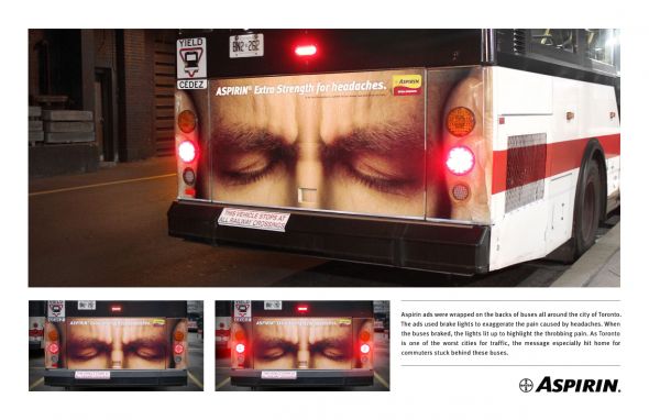 実用的な広告から、ネタっぽいものまで。面白いアイデアが盛り込まれたユニークな屋外広告と野外看板を集めてみました。トピック:薬(アスピリン)のラッピング広告。ブレーキランプがズキズキする痛みを誇張して表現していて、見るからに辛そうです。
