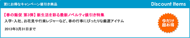 販促ノベルティ卸売りセンターでは、通常価格よりも更にお得な!値引きキャンペーンを期間限定で開催いたします。是非、お得なこの機会に名入れノベルティをご検討ください。皆様のご利用をお待ちしています。2013年3月31日まで。