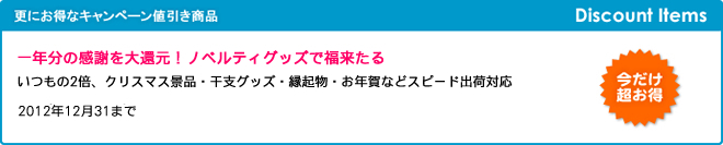 本年も残すところあと30日。販促ノベルティ卸売りセンターでは、今年最後の値引きキャンペーンを通常の2倍の特大規模で開催いたします。お得なこの機会に、名入れノベルティを是非ご検討ください。皆様のご利用をお待ちしています。2012年12月31日まで。