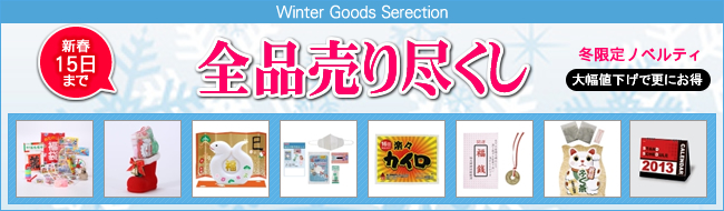 新年、明けましておめでとうございます。本年も販促ノベルティ卸売りセンターをよろしくお願いいたします。今年最初の値引きキャンペーンは「冬限定ノベルティ全品売り尽くし」です。尚、冬限定ノベルティは、2013年1月15日までのお取り扱いとなってます。