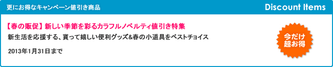 販促ノベルティ卸売りセンターでは、通常価格よりも更にお得な!値引きキャンペーンを期間限定で開催いたします。是非、お得なこの機会に名入れノベルティをご検討ください。皆様のご利用をお待ちしています。2013年1月31日まで。