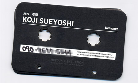 手書きの電話番号とオーディオカセットテープ型の名刺