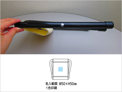 折りたためば、こんなにコンパクト。名入れは、座面中央の50mm×50mmの範囲内に、シルク印刷で対応いたします。