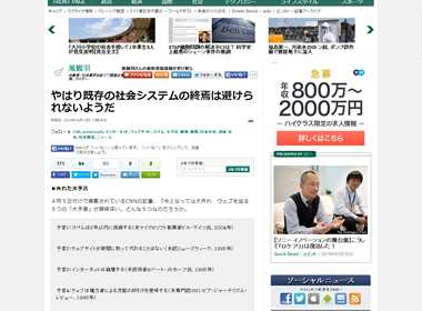 外れた大予言4月5日付けで掲載されているCNNの記事、『今となっては大外れ ウェブを巡る5つの「大予言」が興味深い。どんな5つなのだろうか。予言1:スパムは2年以内に消滅する(米マイクロソフト創業...