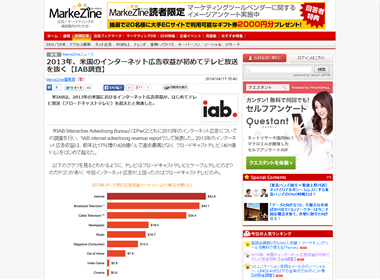 米IABは、2013年の米国におけるインターネット広告収益が、はじめてテレビ放送(ブロードキャストテレビ)を超えたと発表した。米IAB(Interactive Advertising Bureau)はPwCとともに2013年のインターネッ...