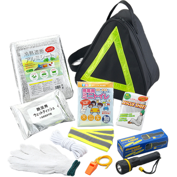 車のトランクに入れて置けば緊急時に大変役立つ10点セットです。 反射テープ付きのバッグに非常時に役立つアイテムを詰めました。車載用、家庭・職場の備蓄品として最適です。 [非常持出しセット]