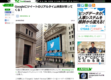Twitterは決算日前夜にGoogleと極めて大きな提携契約を交わしたようだ。Bloombergによると、両社はTwitterのリアルタイムツイートを、「今年の前半」にGoogleの検索結果に含める契約に合意したこの提携によってGoogleは...