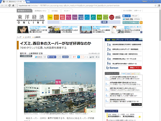 総合スーパー(GMS)業界が苦戦する今、地方のとあるスーパーが好調である。広島県に本社を置き、中国地方や四国、九州で、ショッピングセンター(SC)「ゆめタウン」などを展開する、イズミだ。4月7日に発表した2015...