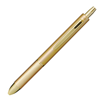 メタルの程よい重量感を感じる多色ペン(3ボールペン+シャープペン)。「BLACK」「BLUE」「RED」のいずれかを天面にしてノックすると、それぞれの色のボールペンとしてお使いいただけます。 [フルカラー印刷]