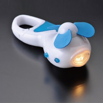 明るいLEDライトも付いたポータブルファン。やわらかいEVA樹脂の羽根で安全です。ベルトなどに引っ掛けられるカラビナ付。LEDライト・携帯扇風機単4×2(別)