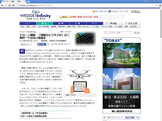 簡単に問題が解決しないことは世間に溢れている。昨今にわかに注目が集まったドローンもその一つだ。昨年まではネットや一部のメディアが小規模に報道するにとどまっていたが、首相官邸への落下...