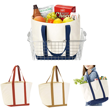 ボタンひとつでマチ有りマチ無しが選べて便利に使えるたっぷり容量のお買い物トート。オレンジ・ネイビー・ベージュ 3色取混ぜ。 入れ口/スナップボタン