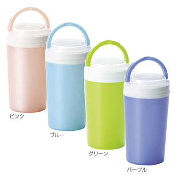 二通りに使えるサーモタンブラー。上部のケースはお菓子や蓋の持ち運びに、持ちやすい形状のハンドル付きキャップ。樹脂製でお手入れ簡単。開口部が広いので氷も入れやすい。ボトル+2種類のキャップ付き。グリーン・パープル・ピンク・ブルー 4色取混ぜ。
