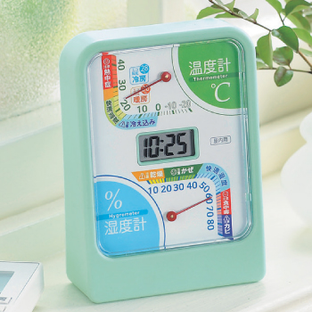 エアコンの適正温度がひと目でわかる!湿度チェックでヘルスケア、壁掛もできます。LR1130ボタン電池1個使用(電池付)