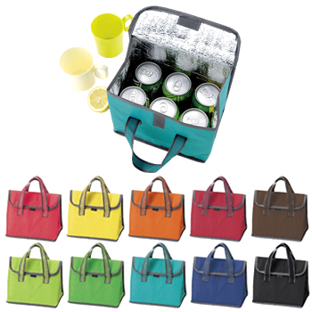 350ml缶が6本入るおしゃれで色鮮やかな2WAY保温バッグ。保温効果の高いアルミ蒸着フィルム張。イエロー・イエローグリーン・オレンジ・グリーン・ブラウン・ブラック・ブルー・ライトブルー・レッド・ワインレッド 10色取混ぜ。