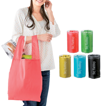クリアカラーケースに入ったカラフルな5カラー展開のお買い物バッグ。持ち手がストライプ柄。イエロー・グリーン・ピンク・ブラック・ブルー 5色取混ぜ。