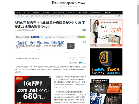 日本百貨店協会が、2015年8月の全国百貨店売上高を発表した。気温が高かった前半は盛夏物、台風の影響で涼しい日が続いた後半は秋冬物が牽引し、総額では前年同月比2.7%増と5ヶ月連続で前年実績を上回った。商品別では、衣料品が...