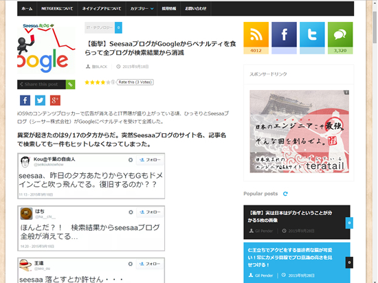 iOS9のコンテンツブロッカーで広告が消えるとIT界隈が盛り上がっている頃、ひっそりとSeesaaブログ(シーサー株式会社)がGoogleにペナルティを受けて全滅した。異変が起きたのは9/17の夕方からだ。突然Seesaaブログのサイト名、記...