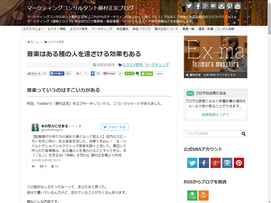 音楽っていうのはすごい力がある昨日、Twitterで「藤村正宏」をエゴサーチしていたら、こういうツイートがありました。【駐車場が少年たちの溜まり場となって困る?】店内のスピーカーを外に向け、ある音楽を流した。...