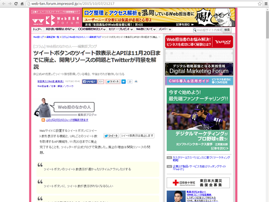 Webサイトに設置するツイートボタンにツイート数を表示する機能と、URLごとのツイート数を取得するAPI機能を、11月20日までに廃止完了することを、ツイッターが公式ブログで発表した。廃止の理由は開発リソースの問題。...