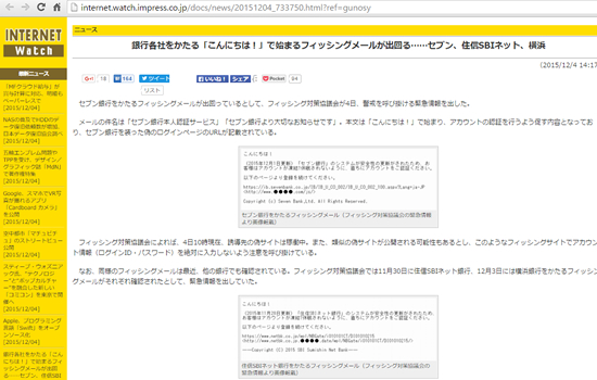 銀行各社をかたる「こんにちは!」で始まるフィッシングメールが出回る……セブン、住信SBIネット、横浜