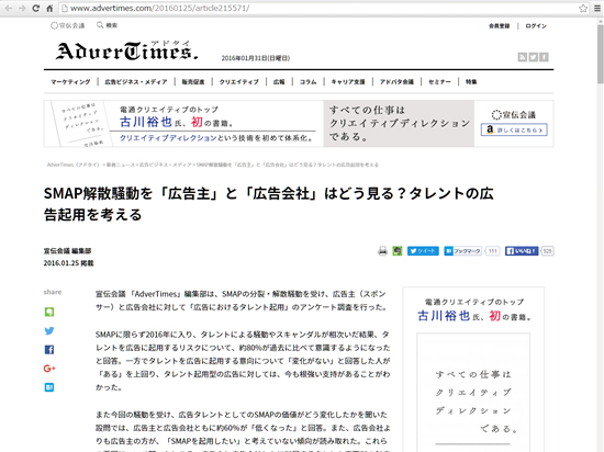 宣伝会議 「AdverTimes」編集部は、SMAPの分裂・解散騒動を受け、広告主(スポンサー)と広告会社に対して「広告におけるタレント起用」のアンケート調査を行った。SMAPに限らず2016年に入り、タレントによる騒...