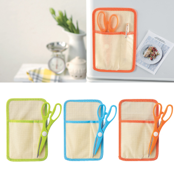 マグネット付きポケットで晴れるカラフルなキッチンハサミ。収納ポケットの裏にマグネット付き、ビジネスデスクにもピタッ!オレンジ・グリーン・ブルー 3色取混ぜ。