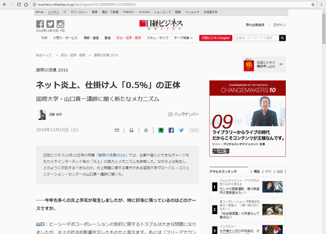 日経ビジネス12月12日号の特集「謝罪の流儀2016」では、企業や個人に大きなダメージをもたらすインターネット発の「炎上」の威力とメカニズムを詳報した。なぜ炎上は発生し、どのように対処するべきなのか。炎上問題に関する著作があ...