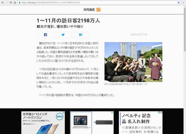 観光庁は21日、1~11月に日本を訪れた外国人旅行者は、前年同期比22.4%増の推計2198万8400人だったと発表した。中国の景気減速などを背景に増加の勢いはやや鈍っており、政府が今年全体の見通しとして示していた2400万人に届くかど...