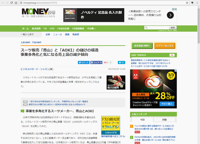 リクルートスーツが大きな収益源であるスーツ販売会社は、少子化を見越して事業の多角化を行っている。大手2社の収益構造と年棒・給与をチェックしてみよう。 事業を多角化するスーツメーカー、青山とAOKI 18年大学新卒向け会社説明会がスタート...