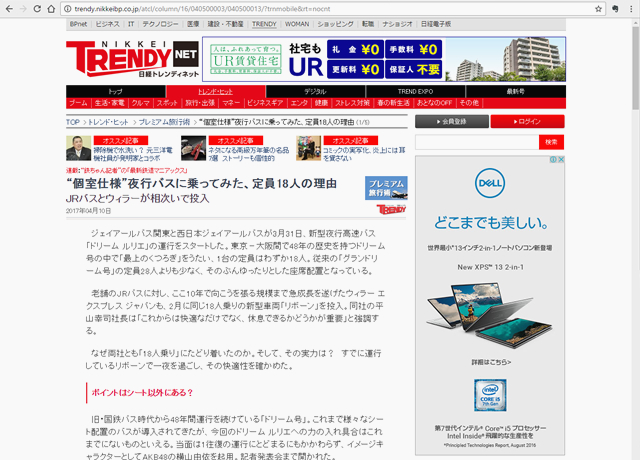 ジェイアールバス関東と西日本ジェイアールバスが3月31日、新型夜行高速バス「ドリーム ルリエ」の運行をスタートした。東京-大阪間で48年の歴史を持つドリーム号の中で「最上のくつろぎ」をうたい、1台の定員はわずか18人。従来の「グランドリーム...
