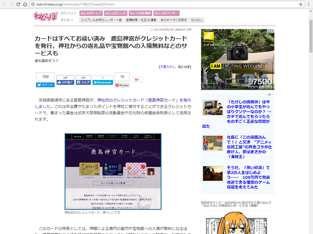 茨城県鹿嶋市にある鹿島神宮が、神社初のクレジットカード「鹿島神宮カード」を発行しました。これは年会費やたまったポイントを神社に寄付することができるクレジットカードで、集まった資金は式年大祭御船祭の活動資金や文化財の保護継承財...