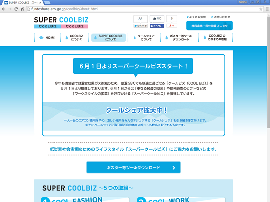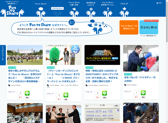 みんなでシェアして、低酸素社会へ。クールビズ(5月1日から10月31日)をはじめ「節電アクション」や「グリーンカーテンプロジェクト」などのストップ地球温暖化への取り組みが、Fun to Share(ファントゥシェア)としてポータルサイトになったようです。