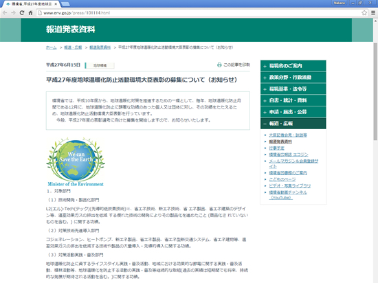環境省の報道資料によれば、毎年12月に行われる地球温暖化防止活動環境大臣表彰の平成27年度の表彰選考に向けた募集が開始されました。環境大臣表彰は、「その年の地球温暖化防止に顕著な功績のあった個人又は団体」に対しなされ平成10年度から続いているようです。