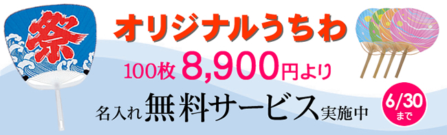 絶賛発売中のオリジナルうちわ・名入れ扇子は、本格的な夏商戦の突入に伴い、名入れ印刷代と版代を無料サービスにてご提供いたします。100枚作って8,900円からの嬉しい格安価格は、≪期間限定≫6月30日まで。皆様のご利用をお待ちしています。