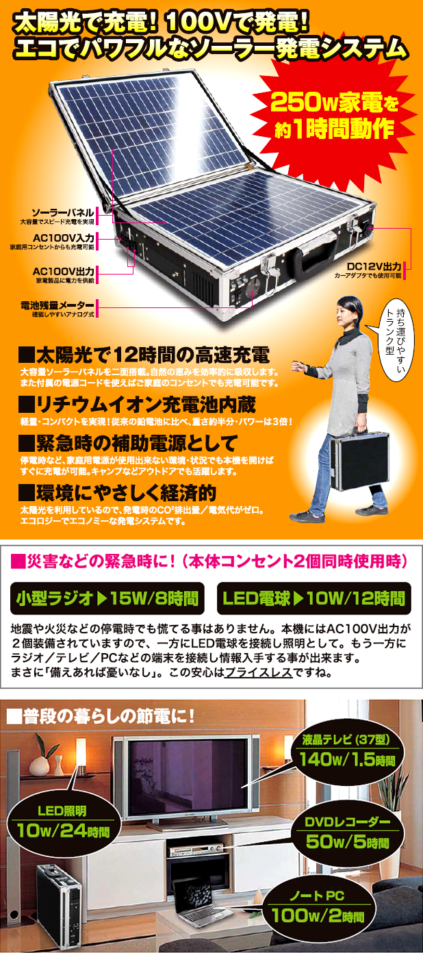 太陽光(ACも可)で充電!100Vで発電!トランク型なので持ち運びもできるソーラー発電システム。日常の節電アイテムとして、アウトドアで、災害などの緊急時にも安定した電力を供給します。一家に1台、オフィスに1台!常備用にいかがでしょうか?