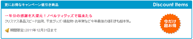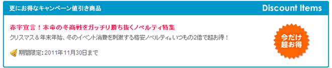 販促ノベルティ卸売りセンターでは、通常価格よりも更にお得な!値引きキャンペーンを期間限定で開催いたします。今年最後の値引きキャンペーンとなりますので、是非、お得なこの機会に名入れノベルティをご検討ください。皆様のご利用をお待ちしています。