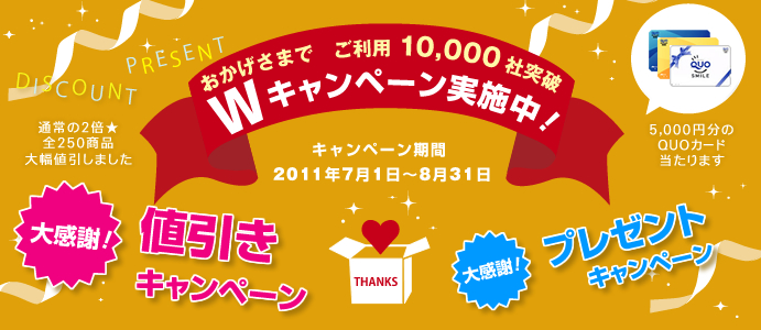 2008年6月のWEBサイト開始から4年。皆様に支えられご利用社数1万社(行政機関・各種団体・個人を含む)を超えることができました。日頃のご愛顧に感謝を添えたダブルキャンペーンを期間限定で開催いたしますので、お得なこの機会に是非ご利用下さいませ。
