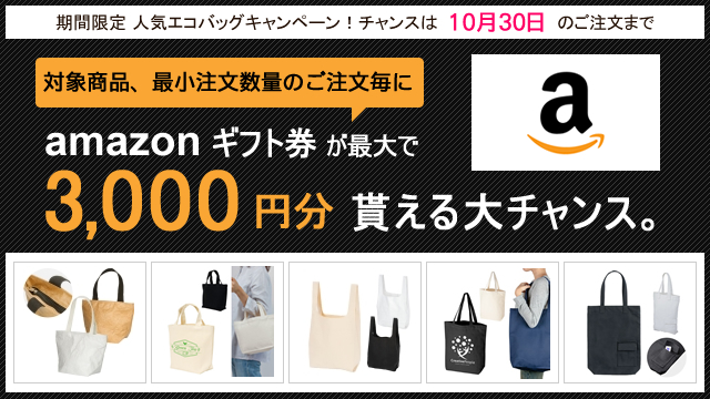 <amazonギフト券付き>人気エコバッグキャンペーンを開催中。対象商品 「注文最小数量」以上のご注文で最大3,000円のアマギフをもれなく全員にプレゼント。チャンスは10月31日まで、お得なこの機会にぜひご利用ください。