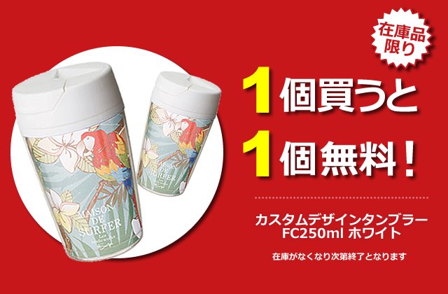 販促ノベルティ卸売りセンターでは、1個買うと「もう1個無料で貰える」キャンペーンを実施中!60個購入で、なんと120個納品されます。定番ノベルティのカスタムデザインタンブラーは今が大チャンス!在庫限り。